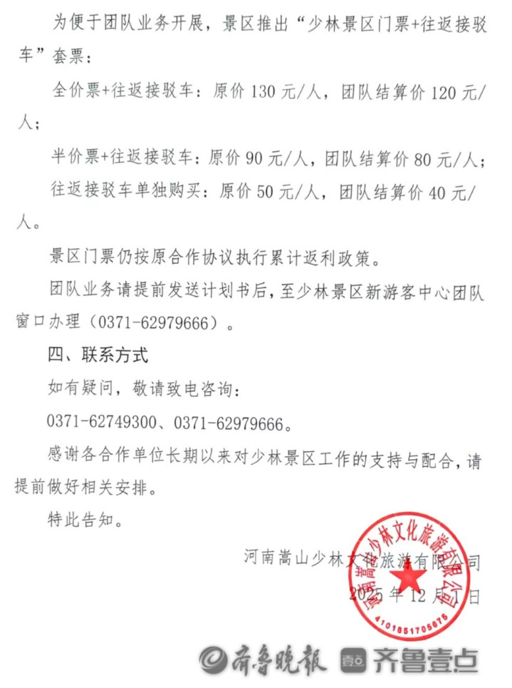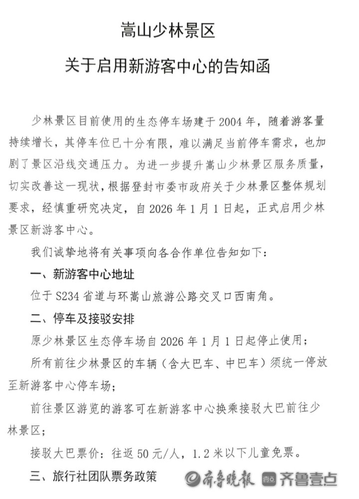 近日,嵩山少林景区发布了一则对于启用新搭客中心的呈报函。呈报函称,因搭客量抓续增长导致原有泊车位不及、沿线交通压力加重,景区决定自2026年1月1日起负责启用新搭客中心,原生态泊车场同步住手使用。左证条件,所有前去景区的车辆须调处停放至新搭客中心,搭客需换乘接驳大巴前去中枢景区,走动票价为50元/东说念主,1.2米以下儿童免票。
