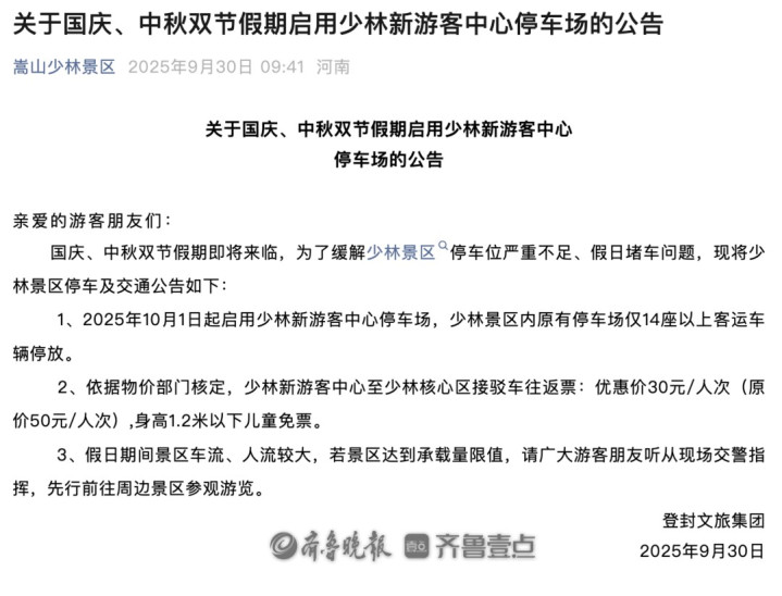 据了解,这并非少林寺景区新搭客中心初度被提上启用日程。记者查询后发现,“嵩山少林景区”微信公众号于2025年9月30日就发布过一则公告,布告国庆、中秋双节假期工夫启用少林新搭客中心泊车场。其时规章原有泊车场仅供14座以上客运车辆停放,接驳车走动优惠价30元/东说念主次(原价50元)。这次12月1日的呈报函,则将停放条件扩大至所有车辆,且未说起接驳优惠。